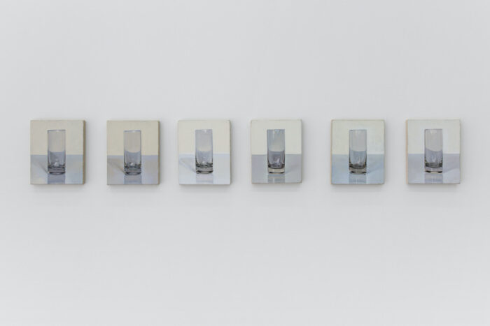 Among the most eloquent works on view are Peter Dreher’s six cups, part of his wrestling match with permanence and legacy as he painted one glass per day as part of his cycle “Tag um Tag guter Tag” (Day by day good day), accumulating over 5,000 paintings since 1974. Connecting old-fashioned contemplating of Morandi with post-World War II anguish and desolation these glasses are the artist’s attempts at finding peace and purpose.