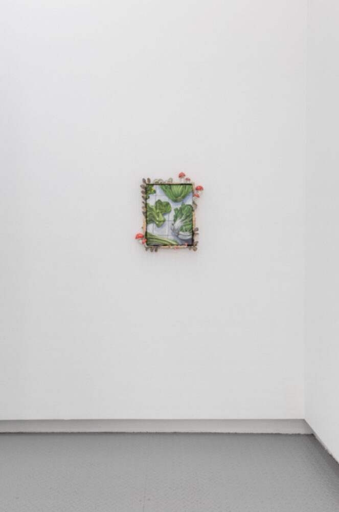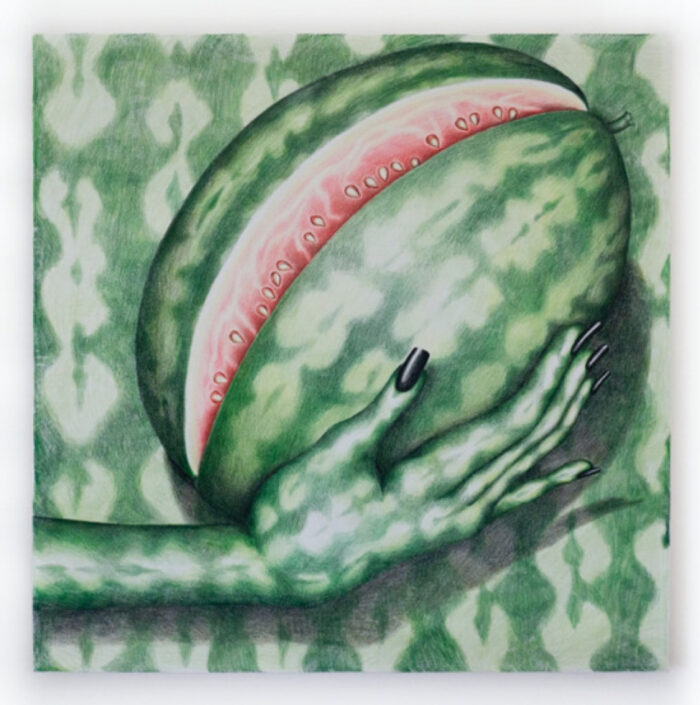 Samantha Rosenwald and Stephanie Temma Hier add delightful and unexpected strokes to the subject of mimicry and, its opposite, unmasking, thus forming conceptual parameters for all other works on view. In Rosenwald’s “Slit,” an eloquent drawing on canvas, a sumptuous watermelon changes its identity to adhere to its environment or perhaps an environment is undergoing that change, adapting to a predatory looking fruit. While Stephanie Temma Hier’s ceramic snakes and mushrooms refuse to be confined to their small premises, unmasking and leaving behind traditional still life subjects (clams, a bunch of salads) painted with oil. All other works vacillate between this opposition and full acceptance.