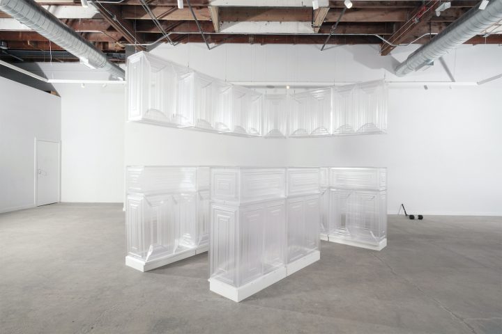 Emily Barker’s transparent Kitchen, 2019 seizes upon American idea of standard. By constructing kitchen cabinets made of PET plastic and standardized height of countertop at 5.9,” the average height of an adult American male the artist eloquently confronts our idea of what the preconceived. Mass production that should care for the good of the society, but fails to do so.