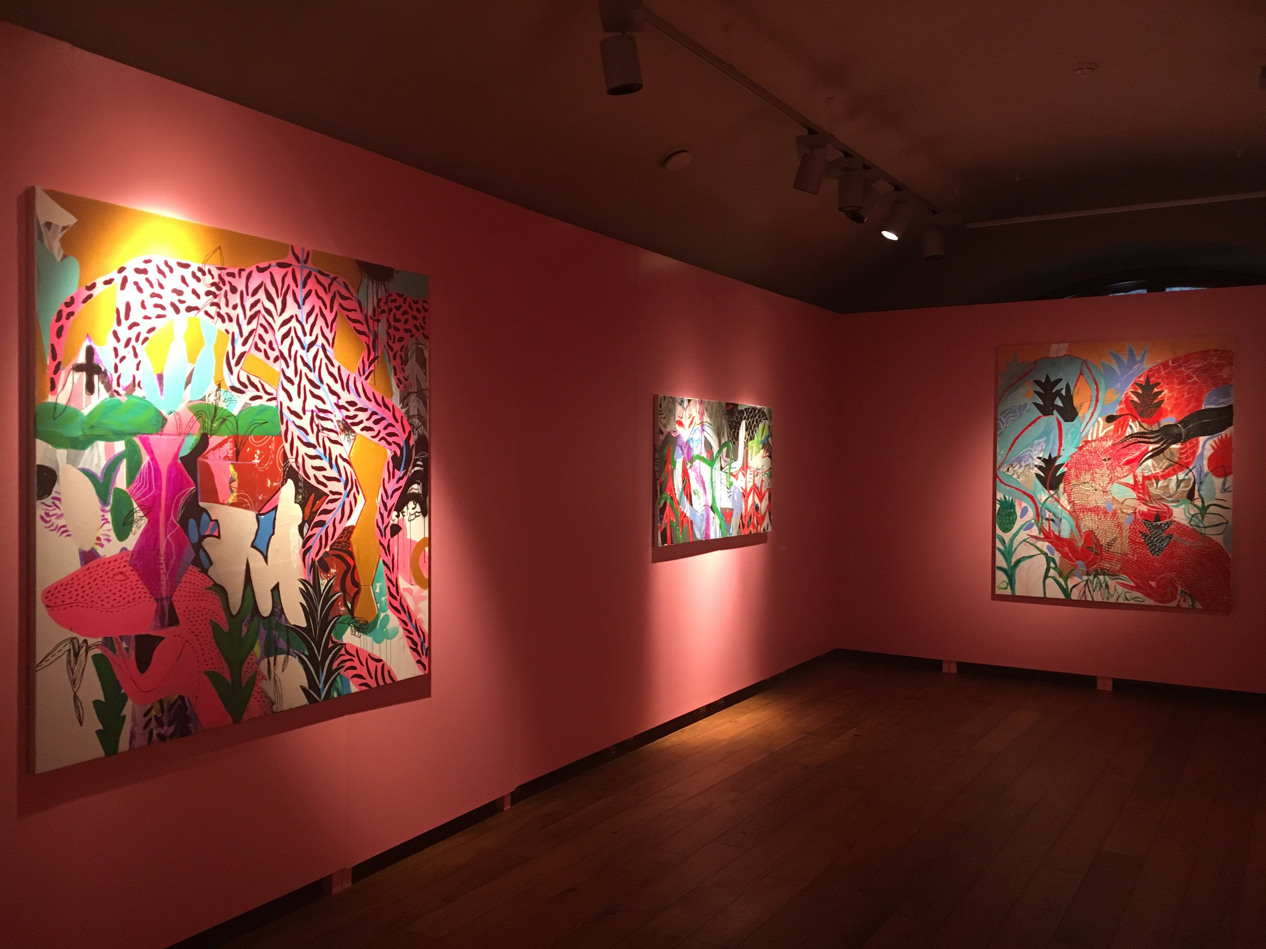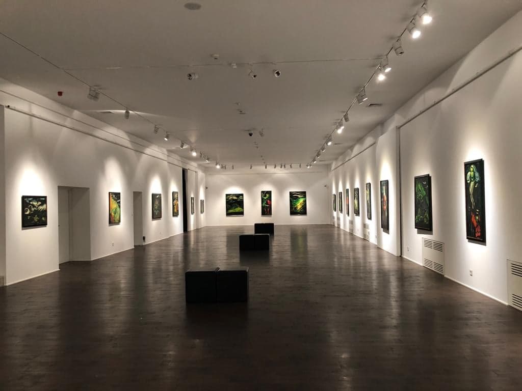 There are two sides to the global story that Rusudan’s neo-expressionist paintings in this exhibition highlight, and they both address existential concerns with the reality of subjective experience. First is a more metaphysical, cerebral approach to the complex and painful ongoing social transformation. We all witness total digitalization of human society, our smartphones have already become our extra palms, but this disconnect from physical reality (inevitably reconstructed into pixels) produces an equal longing towards nature, desire to reunite with it, to reconquer our animal and plant selves. In her series “Into the Nature” (with “Conversion Device” being the central painting), Rusudan explores this unique process. Flora is merging into fauna and, through blurring of these organic lines, a human being also becomes a part of them. In her vision, humans become integral parts of nature on a deeper biological level, they become a new species by going back to their roots. In the day-to-day reality of total information flow, we are drawn by the incomprehensible and the strange, and what could be stranger then nature? It is a metaphysical creation of a parallel world, which becomes intelligible to others without words.