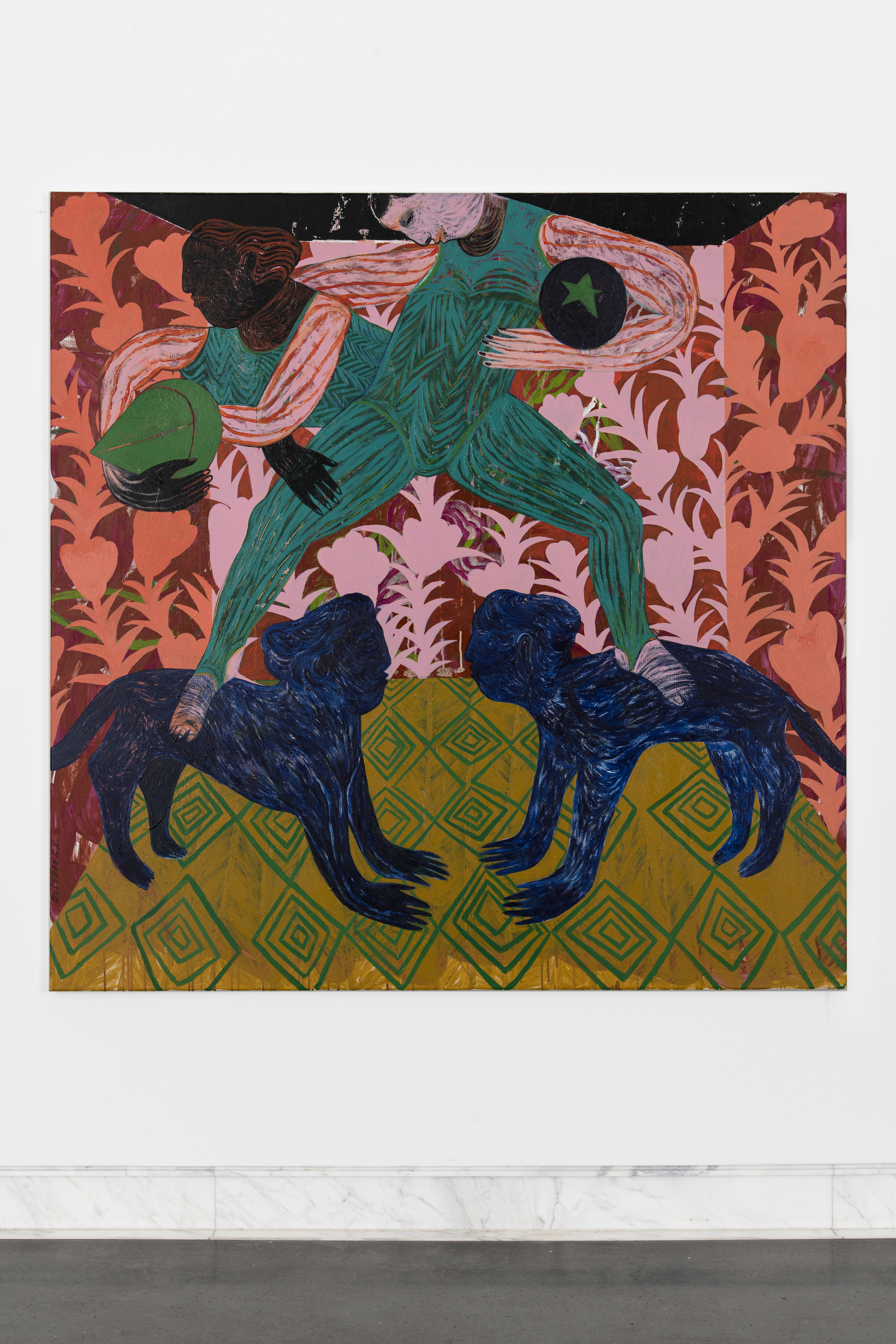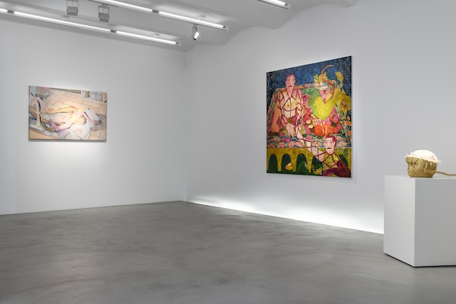 Khizanishvili balances between Georgian culture, rich in traditions, and the conceptually driven contemporary discourse on representation and its functions. The fourteen works on view were all created in 2020 while the artist was living in Tbilisi, and can be thematically divided into two categories: works centred around sacral transformations, and those featuring theatrically staged interactions within rooms. These two themes are implicitly interconnected for the artist, as the human being and her identity are of central interest. Questions of self, connections to biology, cultural memory and myths, and the female body are all the subjects of an ongoing investigation for Khizanishvili, who shows maturity of purpose and mastery of colour.