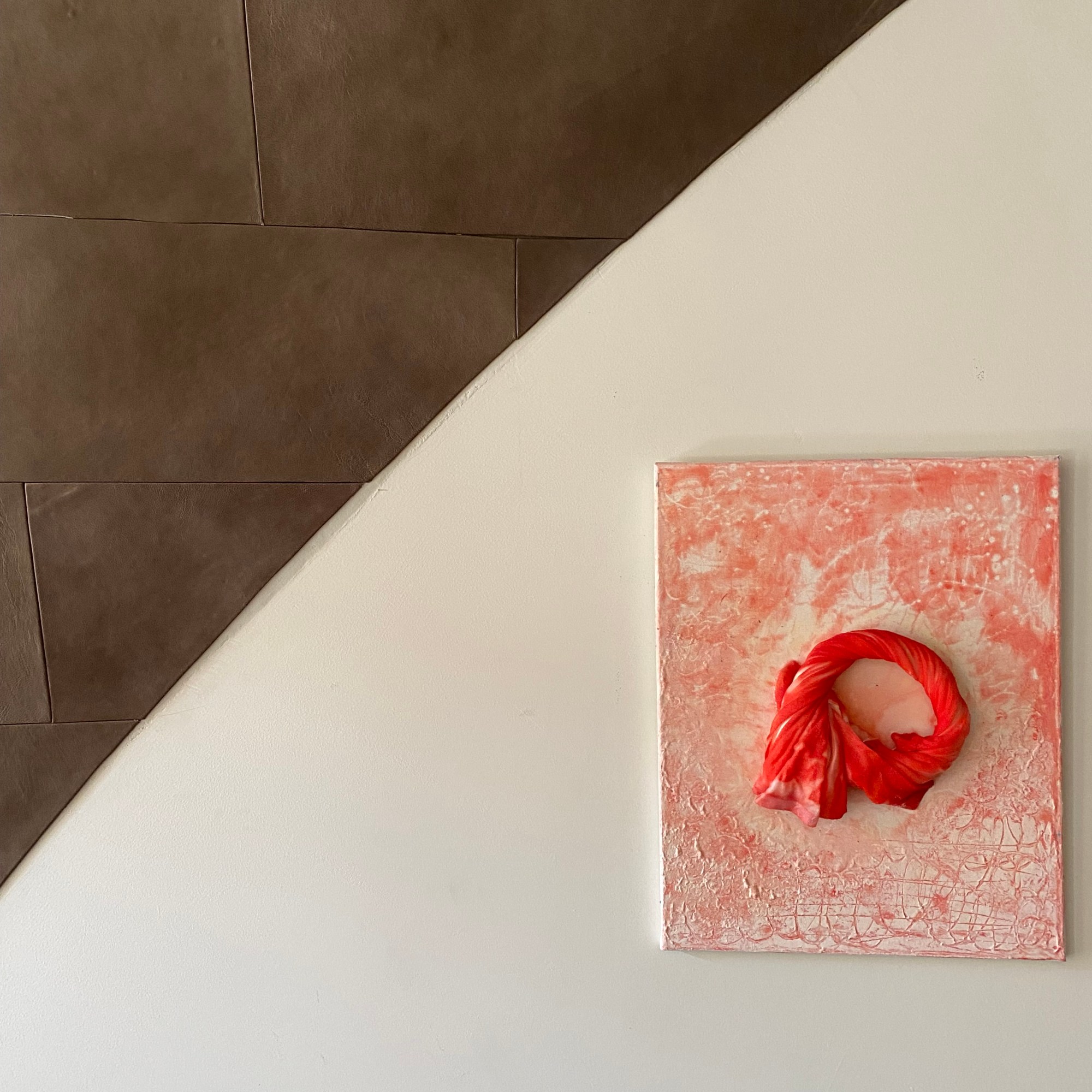 When encountered in public spaces objects by Robert E. look as rock formations or natural patterns developed in a very specific ecosystem. This is expected as Robert E. uses liquid resin, clay, and cotton fabric for his assemblages and canvases. Artist revisits classic definition of the Process or post-Minimalist art and is in line with Richard Serra, Morris Louis, John Hilliard. As them Robert E. positions characteristics of the process of art creation as the focal point, process of altering the material is the central point of access to a viewer.