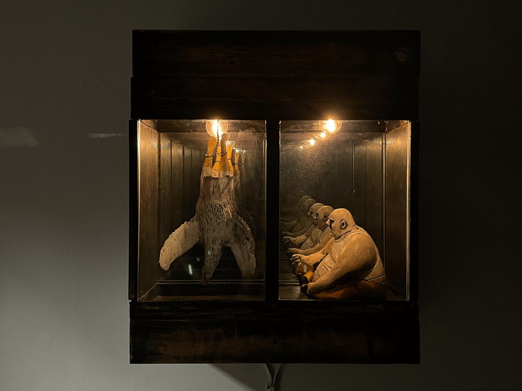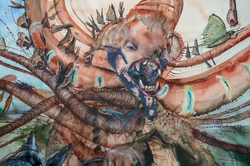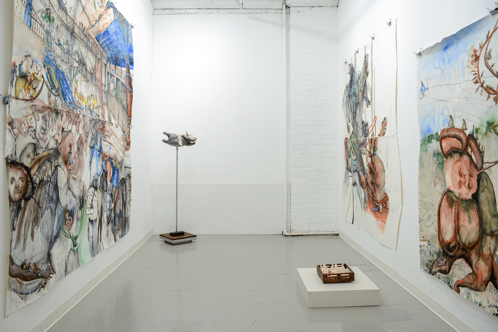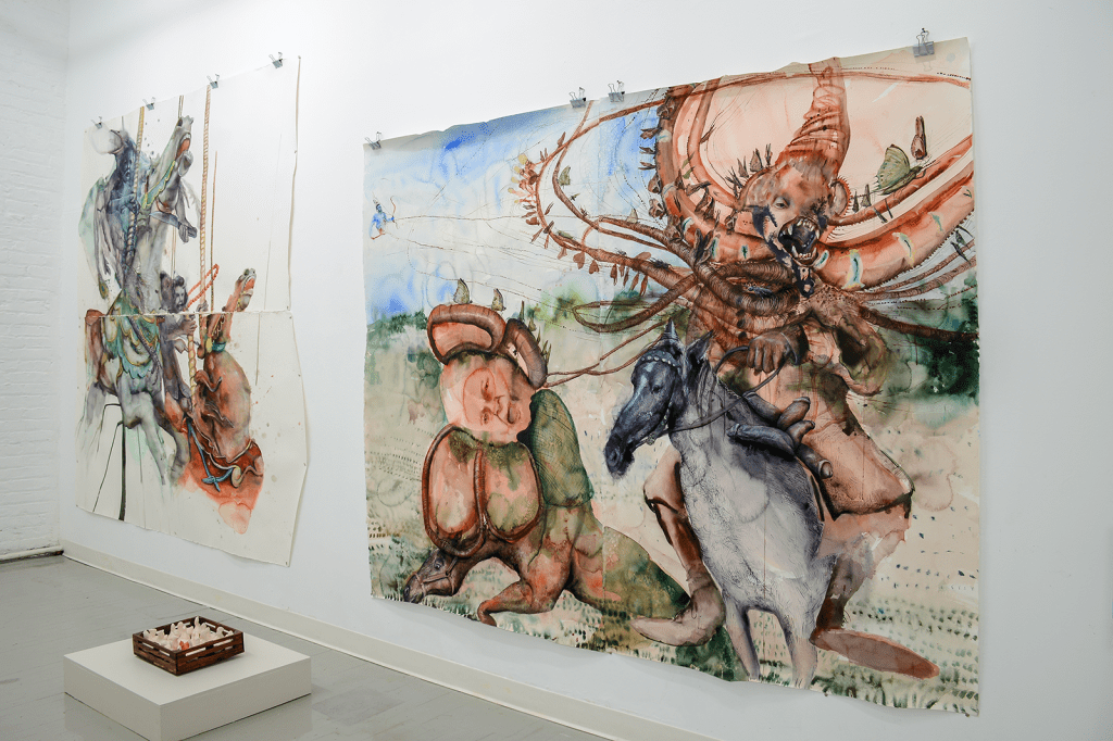 In the dual show at the Border Project Space, Brooklyn-based drawer and painter Shiri Mordechay and South Carolina-based multidisciplinary artist Roberto Clemente de Leon will present six distinct works that challenge our understanding of shared reality and its norms. Viscerally connected to the Theater of the Absurd, one of the most distinguished cultural movements of the XX century, Shiri Mordechay and Roberto Clemente De Leon dazzle with their alternative ways of seeing human society. The illusive narrative they work with might come across as dark, but nonetheless it is raw and real. As European playwrights Samuel Beckett, Eugène Ionesco, Jean Genet and Harold Pinter the two artists address the absurdity of contemporary society. They construct works where humanlike figures, animals and hybrid creatures find their way from a subconsciousness into the daylight and also confront us with the way we treat them. Presenting the works at the Border Project Space known for its experimental approach is timely because both artists speak to the present. They offer a vision that could be our reality, but does not have to be if we make different choices. For Mordechay the setting is her psyche, a dimension that exists within the inner eye consisting of realism of this plane, but also of other imaginary planes. De Leon’s setting is any animal farm across the U.S. and the world where millions of animals are slaughtered based on popular demand.